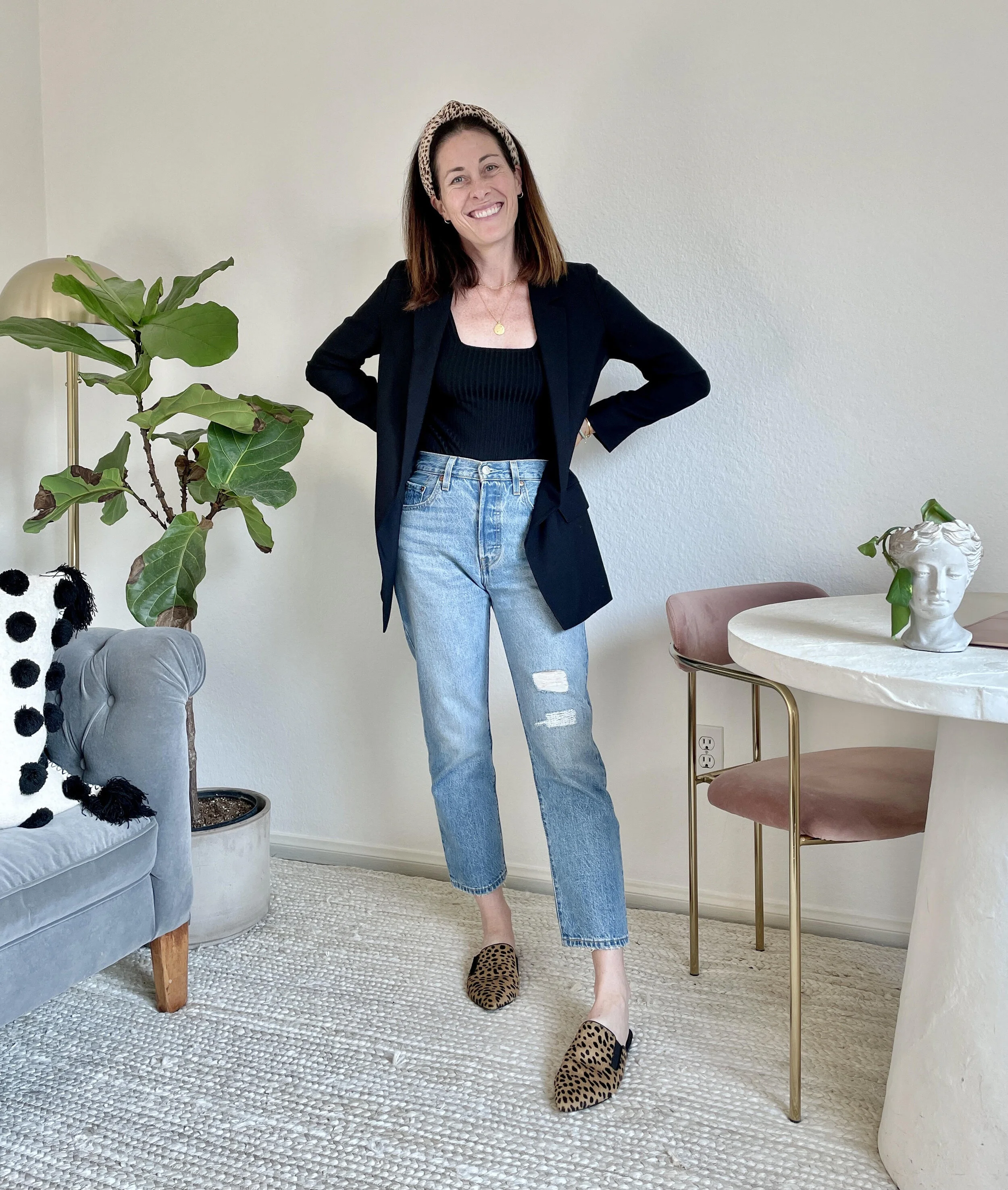 Mules are a fantastic transitional shoe that can take straight leg jeans from summer into fall. My Jenni Kayne mules (these fit true to size) are another go to for throwing a print into my outfit when the rest of the outfit is solid. I’m wearing the same bodysuit and blazer above but the mules make it a day-friendly, work-possible outfit!